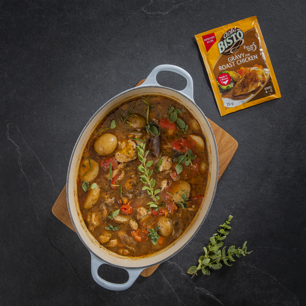 Heat the oil in a casserole pot, sauté the red onions, carrots, celery and peppers for 5 minutes. Add the garlic, Bisto for Roast Chicken Gravy, Hinds Spices Mixed Herbs and Hinds Spices Paprika and rosemary, Fry for a further 2 minutes.