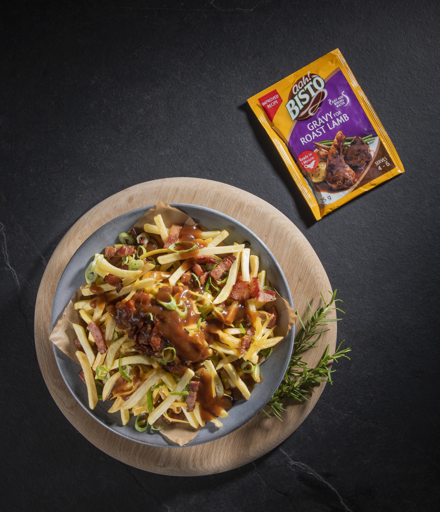 Place the cooked oven chips into a dish. Whisk together the Bisto Gravy for Roast Lamb and boiling water, pour over the chips. Top with grated cheese, bacon bits, spring onion and a sprinkling of parsley.