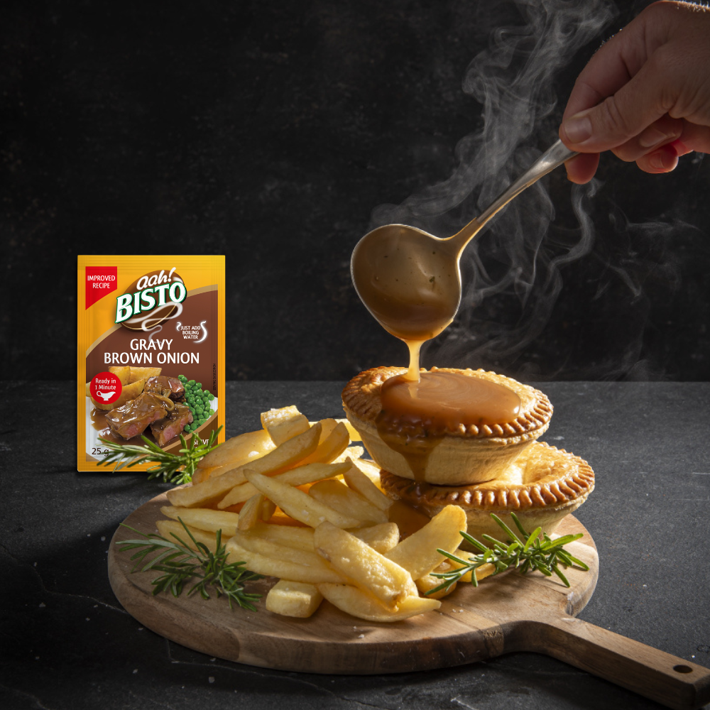 Preheat the oven to 200°C. Sprinkle Hinds Spices Chip Seasoning over the oven chips. Bake the Mama’s pies and chips for 20 minutes, turn the oven down to 180°C and bake for a further 10 minutes.
