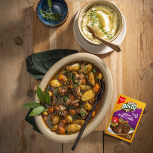 In a large pot or casserole dish, heat the olive oil and sauté the onion and garlic for 2 minutes, add the beef stock, mushrooms, water, Bisto Gravy for Roast Lamb (mix in a little of the boiling water, before adding to the pot), Rhodes Quality Tomato Paste, Hinds Spices Mixed Herbs, bay leaves, potatoes and carrots and bring to a gentle simmer. Season with salt and Hinds Spices Pure Black Pepper.