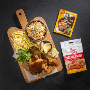 Horizontally slice (butterfly) each steak to create 4 thin steaks. Using a rolling pin, pound the chops a little to tenderise them. Dip the chops in flour, then egg and lastly the Hinds Southern Coating Seasoned Breadcrumbs. Repeat the process.